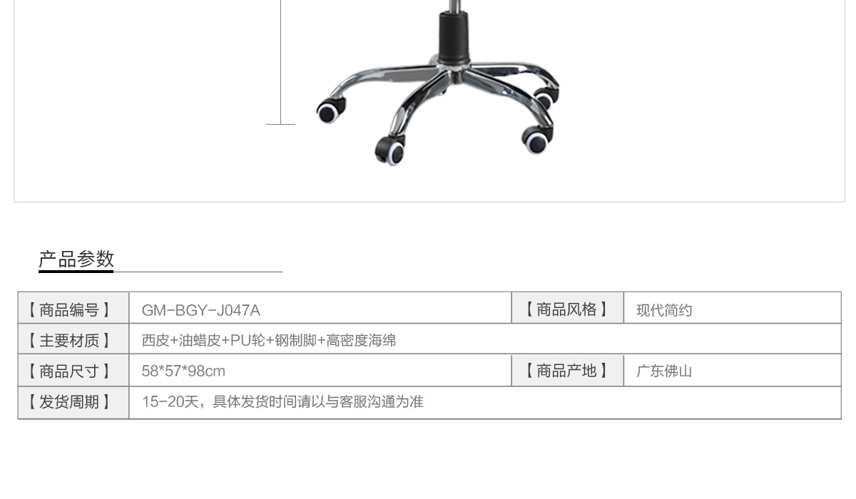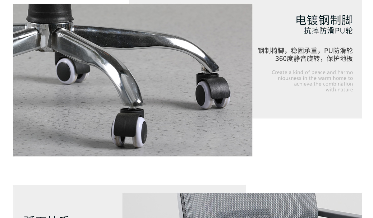 五星腳材質(zhì):電鍍鋼制腳+抗摔防滑PU輪