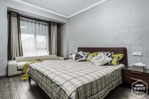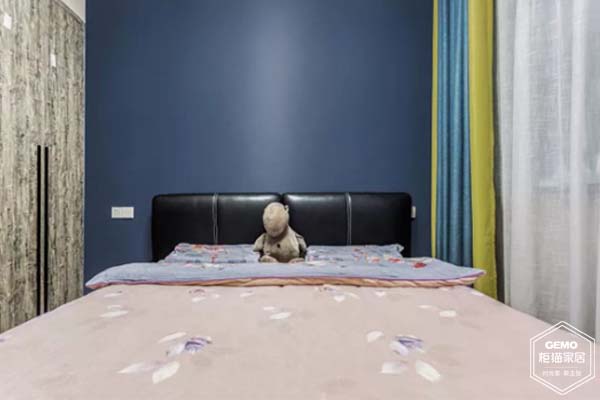 在風(fēng)格上延續(xù)了客餐廳的風(fēng)格,墻面選擇了藍(lán)色,打破了臥室單調(diào)的氣氛,擁有溫度的雙人床,軟綿綿的床品,似乎主臥室只有這張床可以解決所有的疲憊。