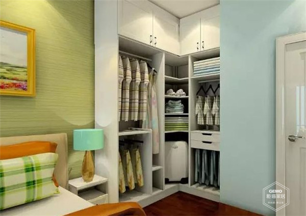 臥室轉(zhuǎn)角衣柜:置頂設(shè)計,頂部為柜體收納空間,下部為隔板設(shè)計,充分利用了拐角處不規(guī)則的空間。