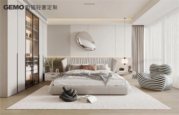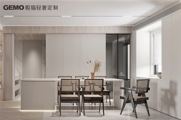 材質的選擇盡量不要選高亮的材質,建議選PET膚感的啞光材質,可以使柜子與墻面融為一體,低調、溫馨、高級。柜子與木門采用同一種材質,能增加空間的統一性,會更顯高級感。