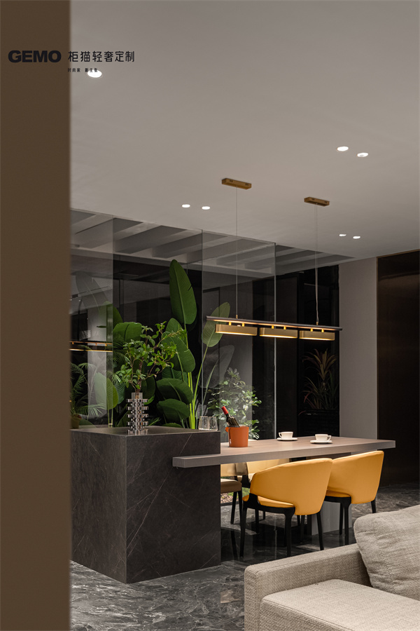 餐桌島臺一體化設計,將備餐、用餐、儲物功能融為一體,高低錯落的布局令視覺層次更為豐富,鏈接著一家人的三餐四季,靜享溫馨的親密時光。餐邊柜采用水吧臺多元設計,休閑、收納、展示功能自由切換,通頂設計高級大氣,在燈光的映襯下盡顯紳士優雅氣韻,營造出愉悅明朗的用餐氛圍。
