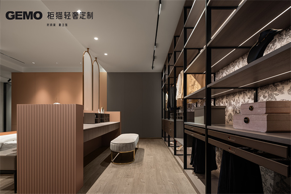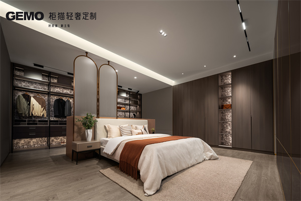 臥室對不同功能分區作有序規劃,集收納、梳妝、休息于一體。開放式鋁木衣帽間設計新潮,利用金屬鋁框的冷硬和木質的溫潤調性打造豐富立體的視覺效果。背板采用獨特的絨花點綴,碰撞出極具個性的雅奢情調。通頂衣柜則以流暢的線性勾勒構筑時尚摩登的高級氣場,入夜華燈初上,在這里點燃一支香熏,盡享身心放松的舒適體驗。