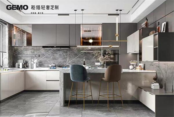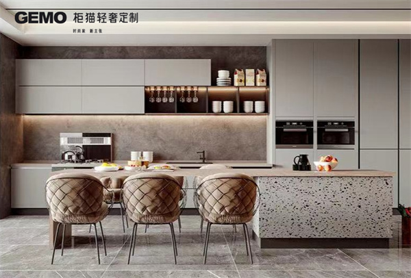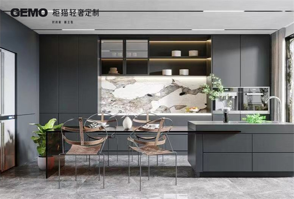 4、藝術(shù)性突出:開放式廚房設(shè)計注重整體的美觀性和藝術(shù)性。可以通過合理的配色和燈光的搭配,使整個廚房更具有藝術(shù)氣息。
