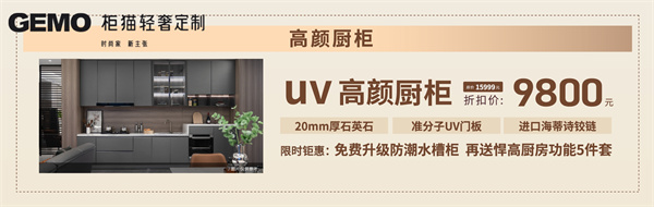廚柜是廚房設(shè)計中最重要的組成部分,也是展示個人品味和生活方式的地方。一款高顏值、多功能的廚柜設(shè)計,能讓整個家庭的生活更加便利和舒適。此次活動僅需9800,包含了20mm厚的石英石臺面、準(zhǔn)分子UV門板和進口的海蒂詩鉸鏈,活動期間下單還可以免費升級防潮水槽柜,再送悍高廚房功能5件套,心動不如行動。
