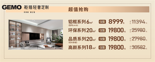 我們在做整家定制主要看的是不是產(chǎn)品的質(zhì)量、環(huán)保、顏值等方面呢?平時想要高品質(zhì)的材料價格都不便宜,全屋下來肯定會超預(yù)算,但是這次的活動可以讓你用低價格也能享受到高品質(zhì)的產(chǎn)品。比如鋁框系列的產(chǎn)品,原價11394,現(xiàn)只需8999;高環(huán)保、高品質(zhì)、高顏值系列的產(chǎn)品,原價2-3萬,現(xiàn)只需19800,超低的價格,超高的品質(zhì)。