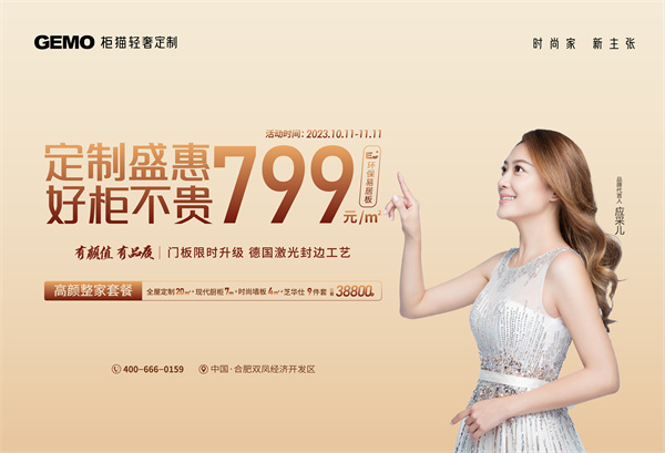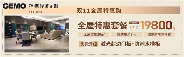 雙11惠購活動來襲,現在定制僅需19800,其中包含全屋定制20㎡+現代廚柜7m+悍高廚房3件。活動期間可免費升級為激光封邊門板+防潮水槽柜,高性價比活動可以讓消費者切實體會到活動的放價力度,用同樣的錢裝出高顏質的家。