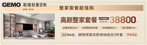 裝修中大多數人想要一次性到位,減少自己所耗需的時間,現我們推出高顏值整家套餐,其中包含全屋定制20㎡+現代廚柜7m+時尚墻板4㎡+大牌家居九件套,現下單僅需38800。+1780還可以換購原價2699的悍高衣柜收納組合3件套。不僅可以省預算,還可以保證產品的質量。