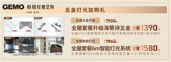 五金和燈光可以起到固定和裝飾的作用,甚有著畫龍點睛的效果,它影響著定制家具的整體性能。選擇全屋套餐的升級海蒂詩進口五金僅需1390,6m智能燈光系統僅需1580。心動的現在就可以行動。