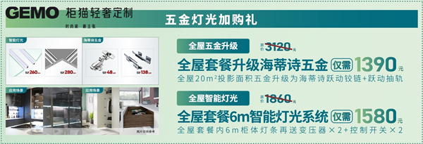 五金燈光是家具必備的配件。好的五金配件和燈光可以提升家具的使用壽命和氛圍感。+1390全屋套餐升級海蒂詩五金(全屋20m2投影面積五金升級為海蒂詩躍動鉸鏈+躍動抽軌),+1580配備全屋套餐6m智能頂管系統(全屋套餐內6m柜體燈條再送變壓器×2+控制開關×2),想了解更詳細的內容,歡迎進店了解。