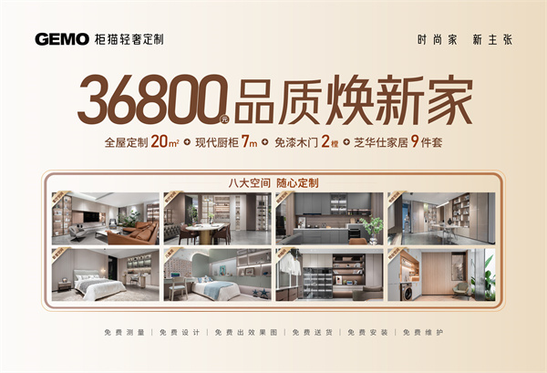 36800元品質煥新家活動,八大空間,隨心定制。活動包含:定制20㎡ +高顏廚柜7m +免漆木門2樘+芝華仕全屋家居9件套。