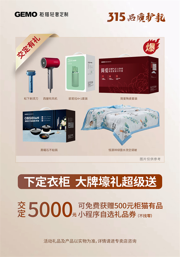 下定衣柜,交定5000元可免費獲贈500元柜貓有品小程序自選禮品券(不找零)。交定還可參與+799元換購價值1199元/㎡的全屋門板德系激光封邊工藝 或實木復合免漆木門1樘;+799元搶購芝華仕乳膠床墊或芝華仕休閑單椅;+7999元享大牌宅配芝華仕客廳兩件套(茶幾YG45+沙發C-1677大三座)或大牌冰洗凈三件套(惠而浦10KG滾筒洗烘+惠而浦十字對開+3M母嬰型凈水器),超值優惠等你來選。