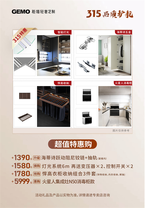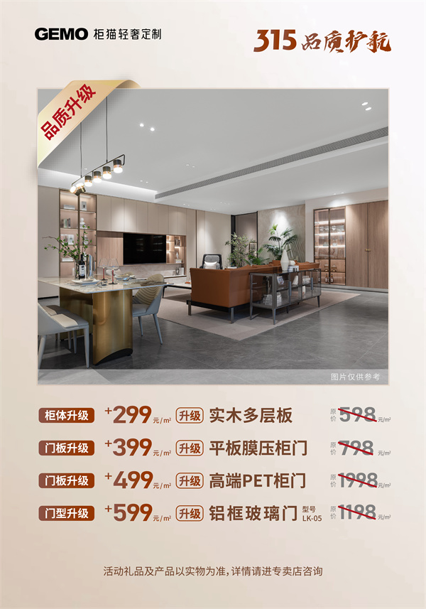 用最優的價格裝最好的品質。柜貓此次推出品質升級活動,+299元/㎡升級實木多層板;+399元/㎡升級平板模壓門;+499元/㎡升級高端PET柜門(單面貼);+599元/㎡升級鋁框玻璃門。