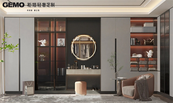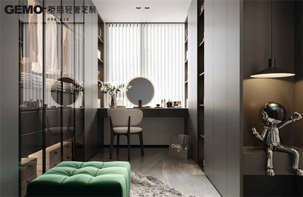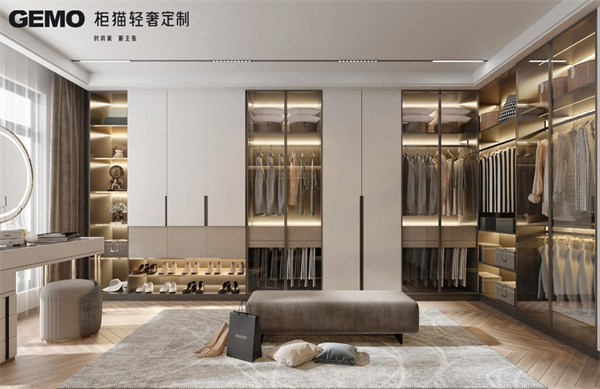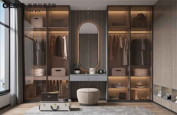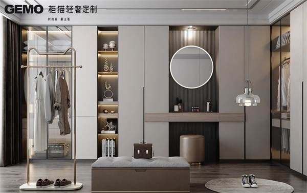 良好的照明設計可以讓衣帽間看起來更加寬敞明亮。可以考慮安裝可調光的LED燈具,以適應不同的使用場景。此外,全身鏡或鏡面滑門不僅具有實用功能,還能增加空間感,讓衣帽間顯得更大。