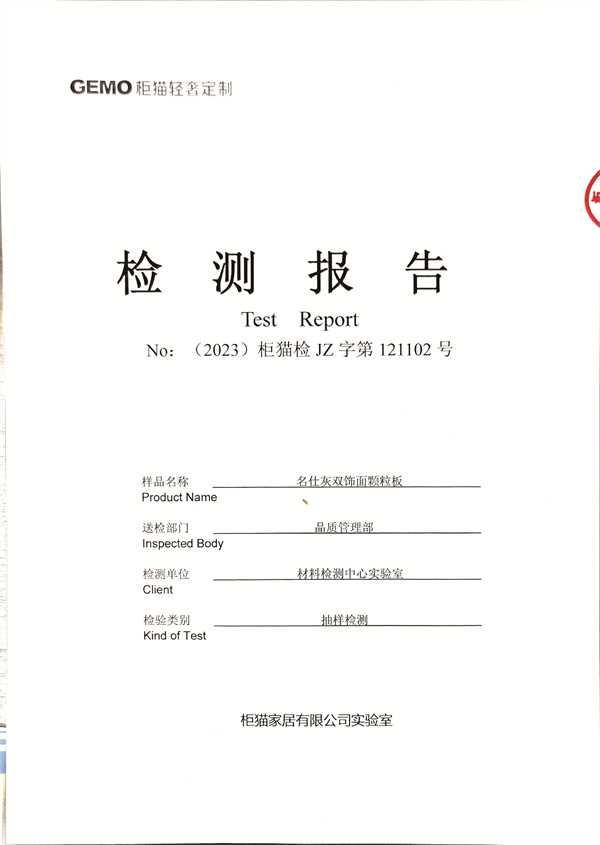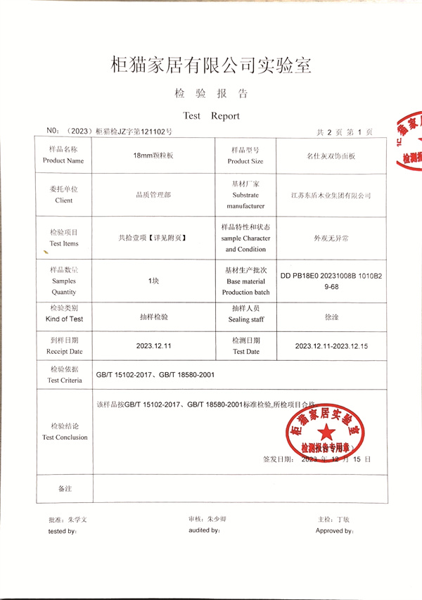 柜貓輕奢定制2023年12月名仕灰飾面顆粒板檢測(cè)報(bào)告