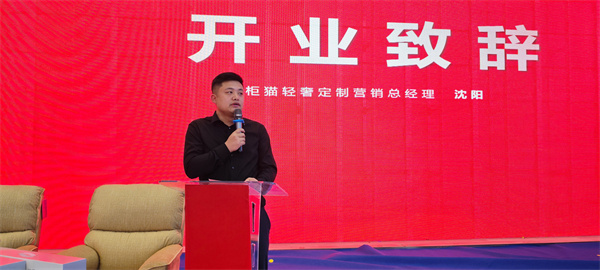 柜貓輕奢定制營銷總經理沈陽發表開業致辭,對經銷商楊晨在浦口紅星美凱龍店(一店)所取得的成就表示高度認可,并對此次新店的落成,表達了打造標桿門店、鑄就行業典范的美好祝愿。